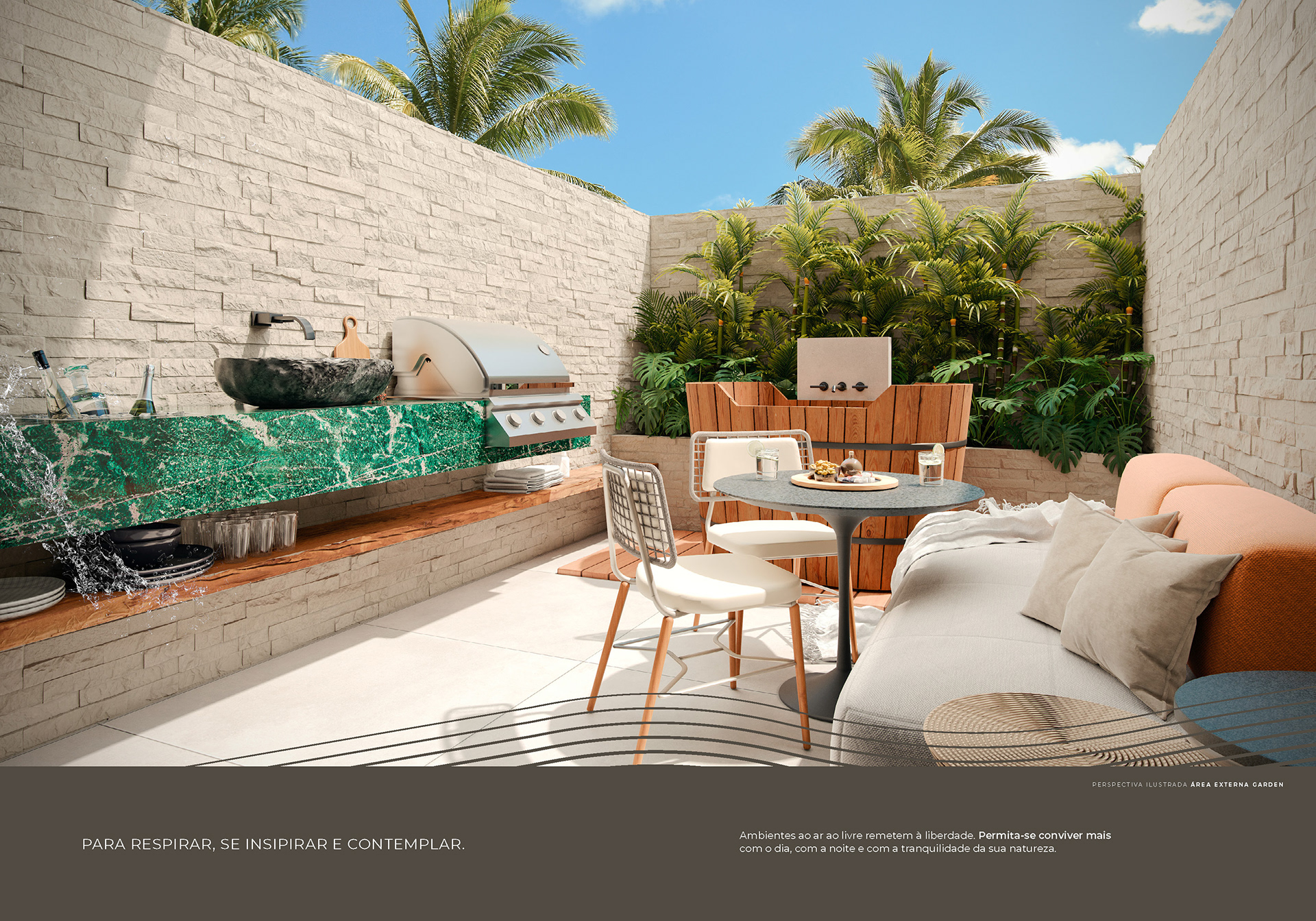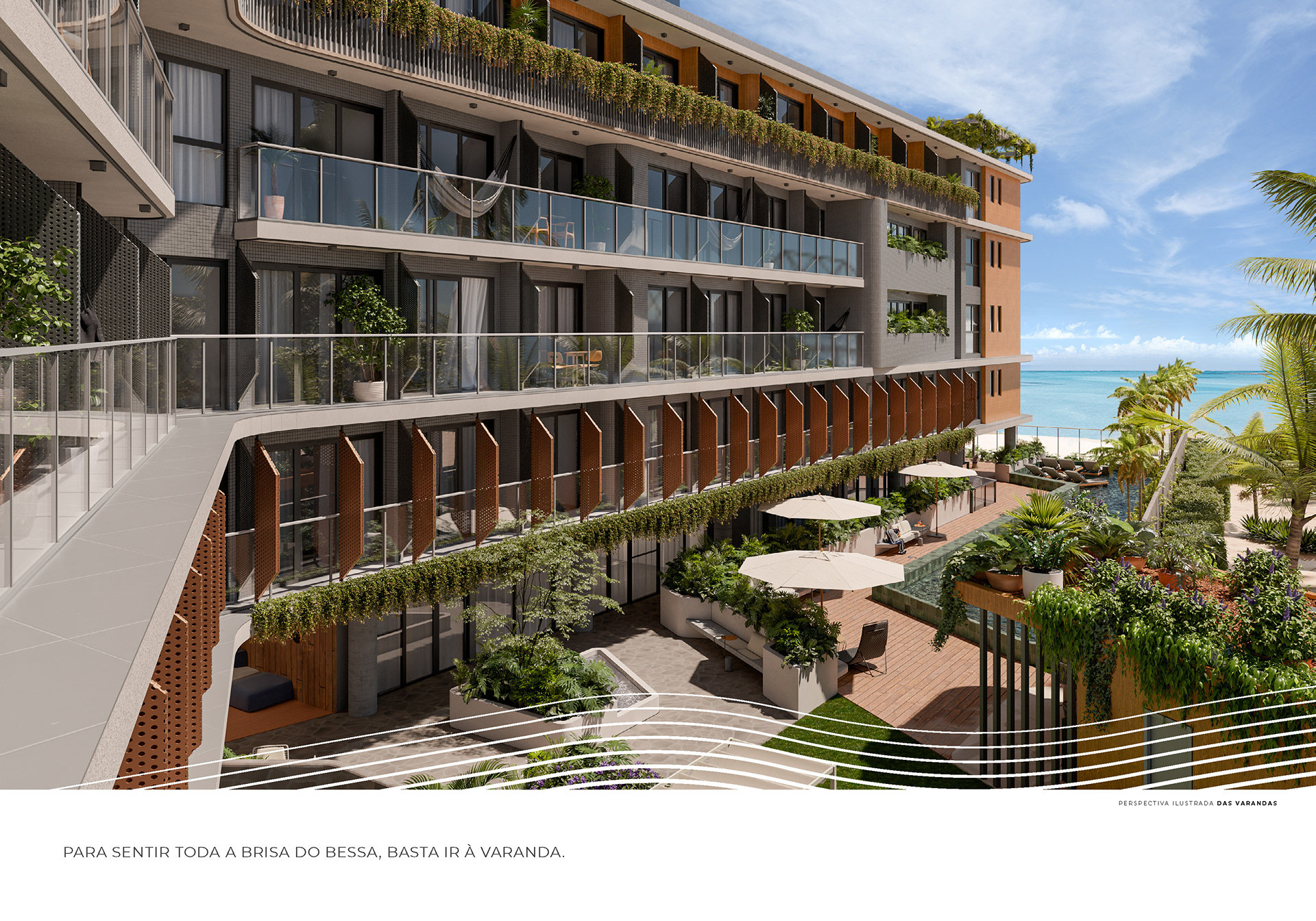 Na fluidez da água, o mar se torna extensão da piscina. Na presença do vento, as varandas ganham atmosfera, leveza e vida. O olhar vai além: o verde substitui muros, os horizontes dissolvem limites e as paredes cedem espaço à liberdade.